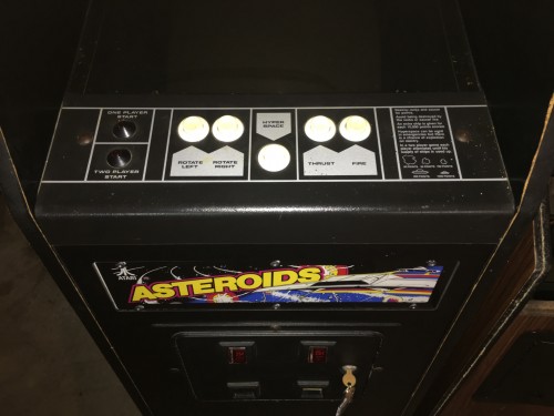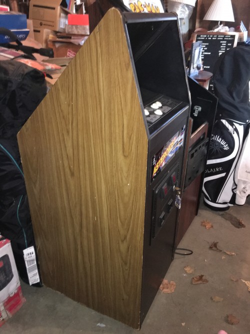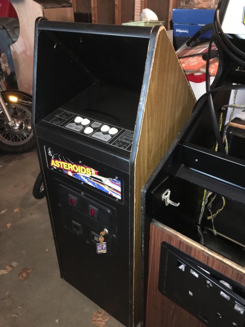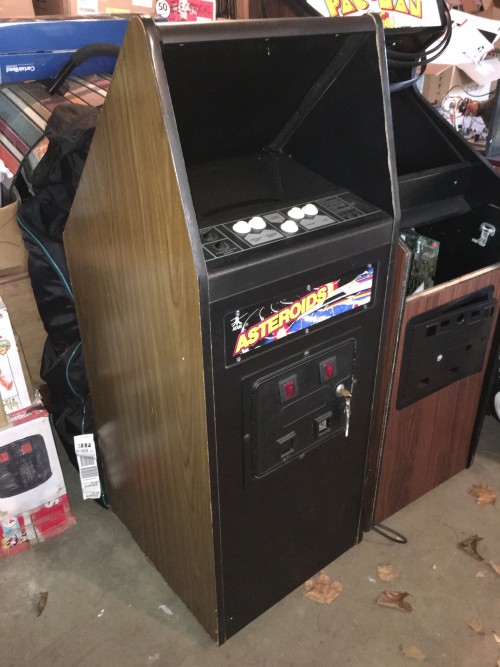 And it happened like 6 months ago! But, since my living and working situation has not been KLOV-friendly for most of this year, I waited til now to post about it. I had my wife pick this up from Gorfchampion back in the Summer. The cab is solid, though does have some moisture swelling on the edges. I will probably eventually peel the old vinyl, sand the particle board flat, brush some wood hardener on the edges, reseal the surfaces and apply new vinyl. I haven't decided if it's going to be woodgrain or custom. In any case, the original screened CP is in excellent shape and the 13" monitor has a great picture. I have always wanted to pick up one of these, ever since I sold my full sized Asteroids when I picked up a Deluxe 8 years ago. There is something about the simplicity of Asteroids that made me miss having one in the gameroom. I also really love the sounds of the original. Well, anyway, I finally own one. I can't wait to move this into the New Galaxy Blue, hopefully sometime in Late January/ Early February. Pics: