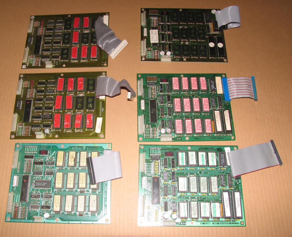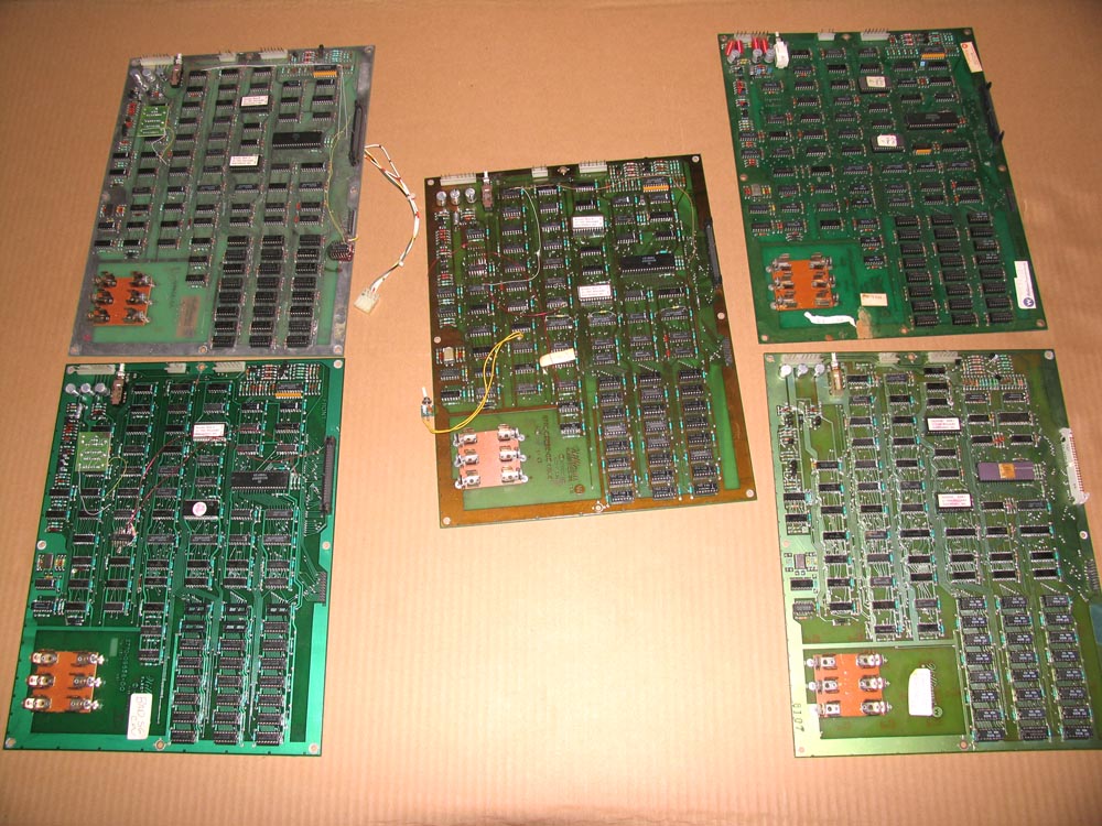 -- 2 Defender ROM boards with some ROMs, 1 unpopulated ROM board marked "BAD Robo board", 1 each populated ROM board for Joust, Stargate, and Bubbles.
