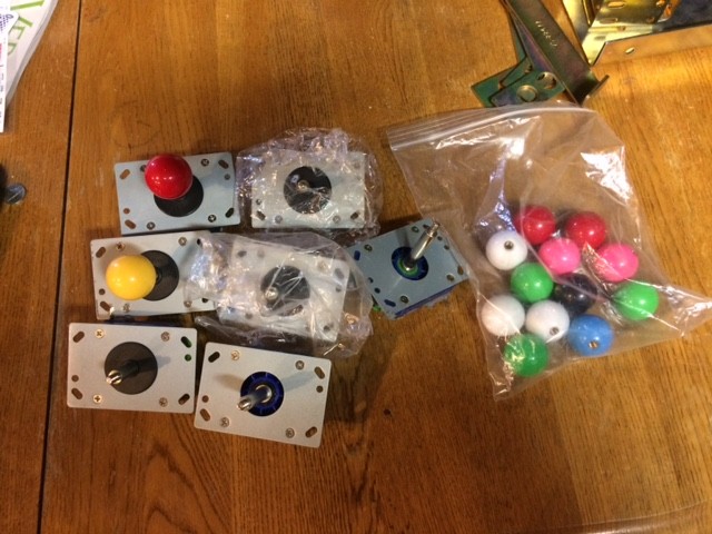 7 joysticks and multiple ball tops. One of the joysticks is missing two micro switches. I believe that most of them are brand new that I got with multicade kits and used better joysticks instead.