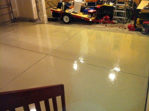 Epoxy flooring. Pretty expensive. I think that I spent about $700 for the entire 3-car garage. The kind where you mix 2 formulas together creating a chemical reaction. So much so that the concoction actually heats up. Anyway, the results were (at first) amazing. Glossy surface. Like a candy shell on my floor. It was very easy to sweep clean and even easier to hose out and squeegee.