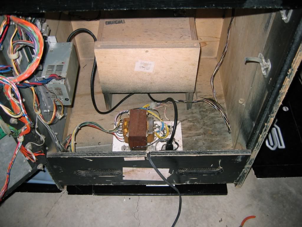 Once the cabinet was good, I was able to size up the power supply situation. The original linear supply was badly hacked up, and I really didn't feel like rebuilding it - especially since there was a switchmode supply here already. This switcher is unusual. It looks like a computer supply, but it's a different form factor than the normal AT style. Also, the power cables coming off it are clearly intended for a Wiliams game - there are three connectors, neatly labeled with 'CPU" "ROM" and "SOUND". I disassembled it and cleaned the considerable crud out of it, and cleaned the fan. While I had it on the bench, I hooked it to a dummy load (a car light bulb), and tested it out. All of the voltages were good, and it seemed to be working properly. I verified that the CPU connector has the necessary -5v line for the 4116 DRAM. So, I have a good, working switchmode supply. But how to mount it? It doesn't have any sort of mounting holes or tabs at all, and when I found it, it was just laying in the filth at the bottom of the cabinet. I ended up building a couple of brackets from the leftover aluminum edge channel. One mounts to the front of the supply, using the two lower fan screws to hold it, and the other I screwed into the bottom of the air vents on the other side, using sheet metal screws. And yes, I did check to ensure the screws wouldn't hit anything. I then drilled holes in the brackets, and mounted the new switchmode supply where the original linear regulator board used to mount. It fits absolutely perfectly there, and the cables _just_ reach all the way out to the CPU board. Makes me wonder how this was supposed to be mounted - as it looks like a professionally made replacement supply.