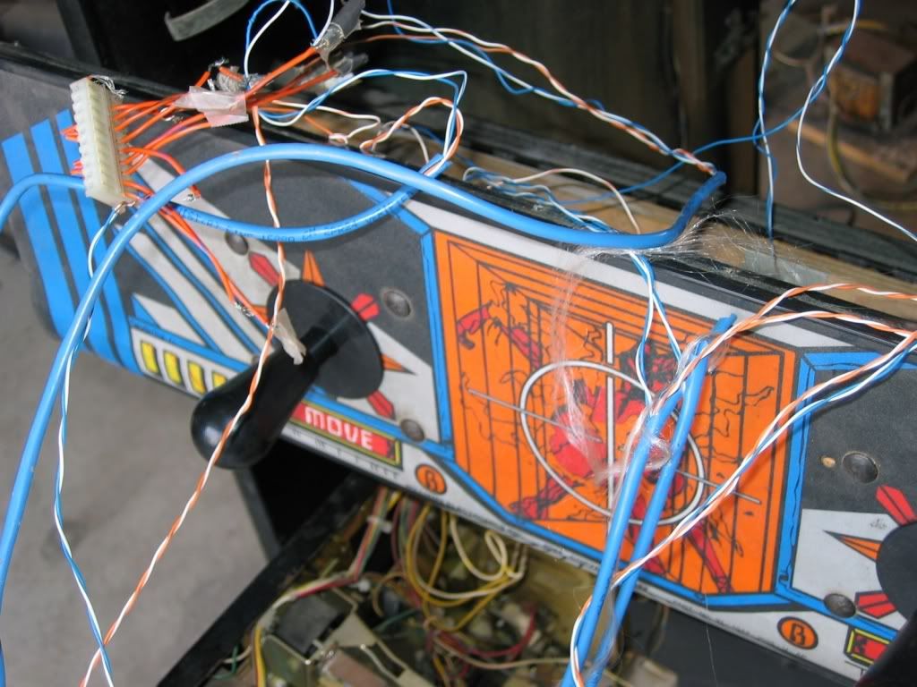 Next on the agenda was the control panel. The harness that goes from the control panel to the cabinet connector is missing, and the cabinet's harness has been cut up, so I opted to build a new one. Using scrap wire from some other partial/scavenged harness, I built a bundle of wires that plugs into the interface board, and terminates in a 12 position molex connector. Similarly, I rewired the panel, removing that awful mess of phone wire, and fitted that with a mating connector. The harnesses took a long time to make, but it sure looks (and works) much, much nicer than the mess that was there.
