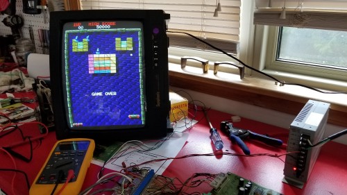 I only have the power and monitor connected to my hack-a-jamma adapter, but so far this looks good! I know have a few Arkanoid spinners in a box somewhere, so I'll have to wire this up complete to make sure everything else is working okay.