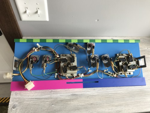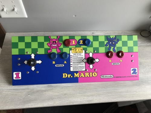 This was one of Rich's overlays he had sent me years ago as a gift. I had stored it away and all but forgotten about it. I then remembered having stripped and powdercoated a Vs. Panel blue several years back. I never really knew what to do with it, so I figured it would work perfectly for my Dr. Mario panel. Over the course of 2 or 3 days I located the buttons, switch holders, brackets, joysticks, bolts, wiring harness, etc and assembled it all together using an original Vs. Panel as a guide: