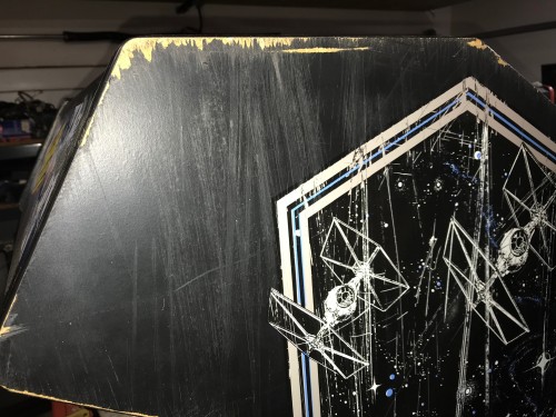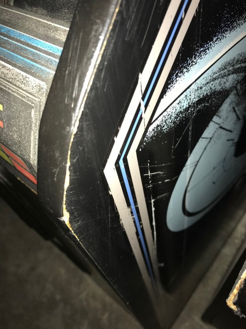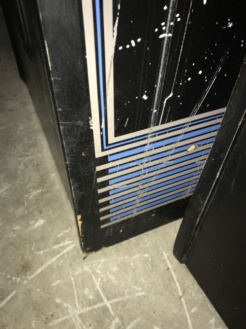 Overall good condition. The right side of the cabinet does have some vertical scraping down the side and some of the black area has been scraped down to the wood. One leg leveler has broke through the base, and will need a leg leveler plate installed. The rest of the cab is in excellent shape.