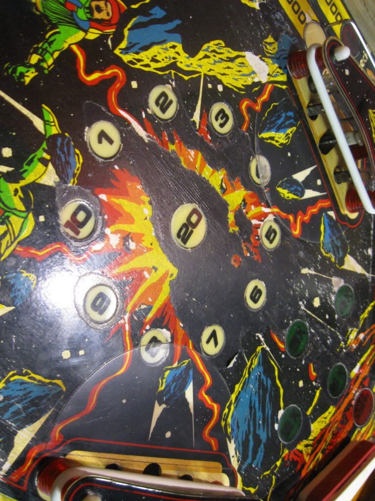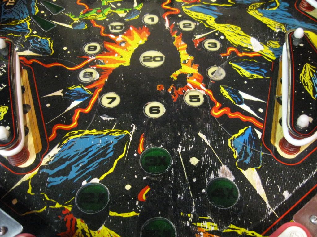 I'm mostly concerned about this playfield. That would be the big problem with getting this machine up to good condition. If you look at the pictures, the upper playfield isn't terrible, the plastics aren't bad, but it's down the middle and the return/outlanes on the lower playfield that aren't good. Any suggestions on what I can do with this, or is this pretty screwed?