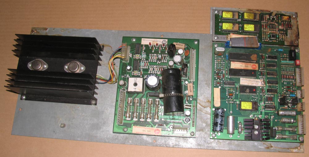 -- A power supply and sound/speech board setup on its original mounting plate. Prototype serial numbers, but I can't for the life of me figure out what game it's for ("PB" ?) Was apparently leaning against a wall in a basement that took on a little water, as you can see there's some corrosion along one edge, worse in one corner.